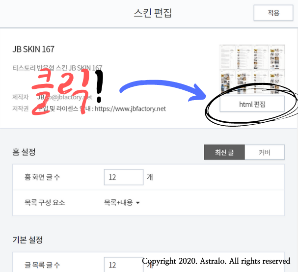 ▼ 원하는 설정값으로 변경하셨다면, 이제 티스토리 스킨의 <HTML 편집> 항목에서 코드를 <HEAD> 부분에 붙여넣으시기만하면 됩니다.