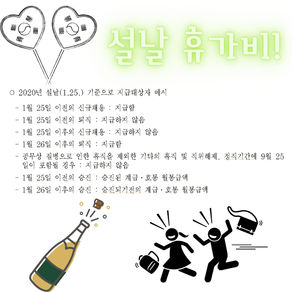 2020년 현재 국가공무원으로 재직 중인 인사에게만 설날(1월 25일)과 추석(10월 1일)에 설날 휴가비, 추석 휴가비를 지급합니다.