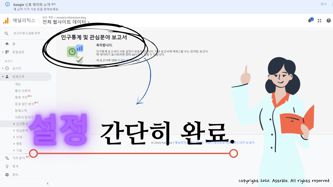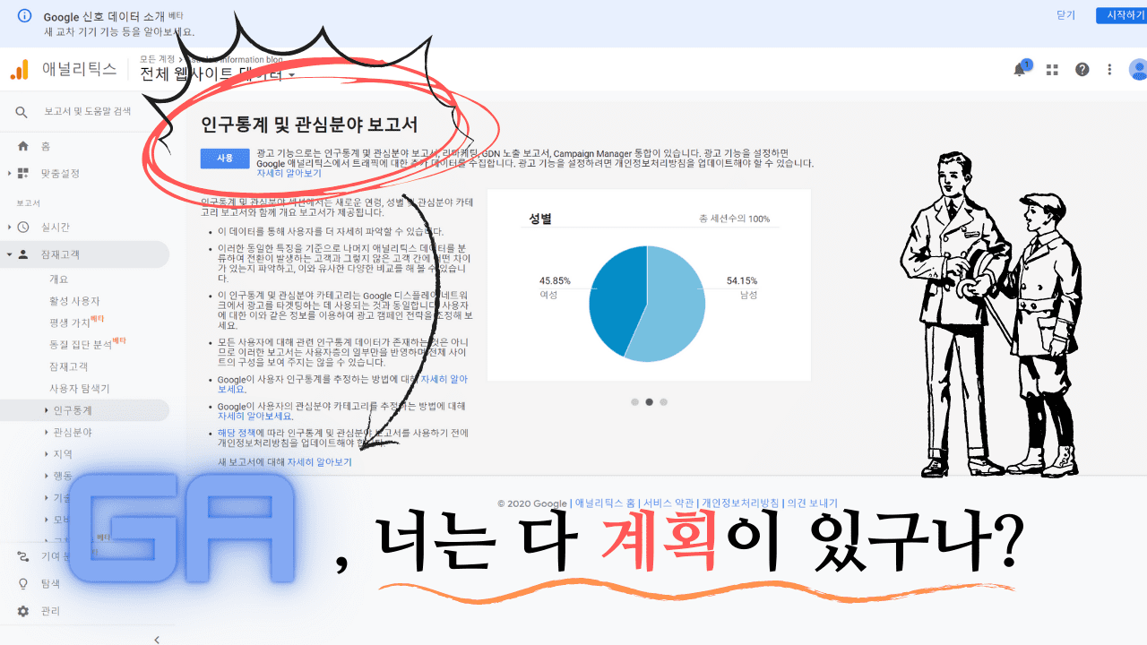 상당히 구체적인 보고서가 될 듯합니다. 특히, 저에게는 방문자분들의 연령과 성별을 알 수 있다는 점이 가장 기쁘네요. 지금 이 글을 보고 계신 여러분들도 저에게 딱, 걸리신 겁니다!