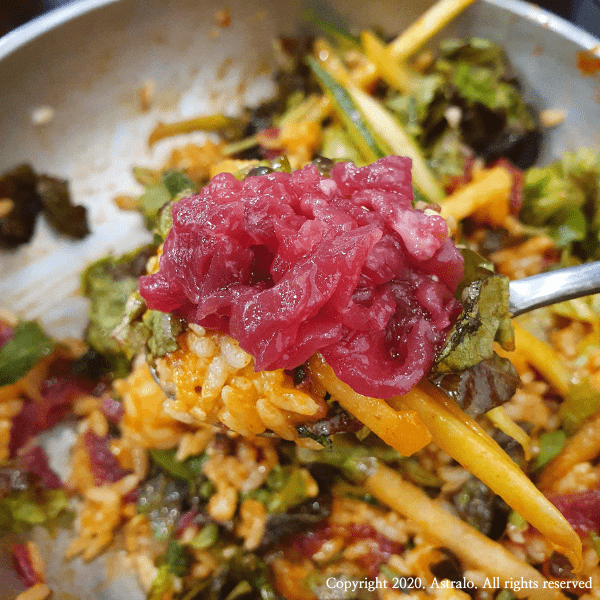 ▲ 우선, 기본적으로 육회비빔밥에도 육회가 꽤 많이 들어가 있음을 확인할 수 있었습니다. 기타 육회비빔밥의 구성은 심플하게 오이, 상추, 배, 나물 등으로 심플하게 구성되어 있었습니다.