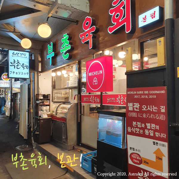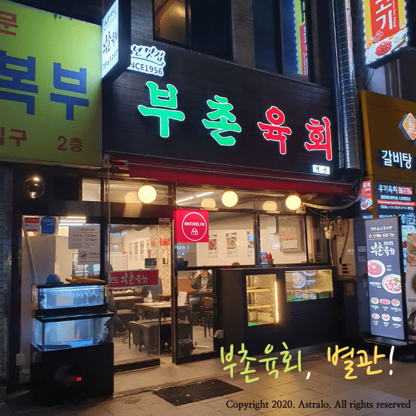 ☞ 부촌육회는, 전통적으로 유서 깊은 서울 광장시장에 위치하고 있습니다. 광장시장은 우리나라 최초의 상설시장이기도 하지요! 이 명성에 걸맞게, 부촌육회도 장장 50년이나 되는 전통을 가지고 있습니다. 또한, 이 곳은 세계적으로 널리 인정받는 '미슐랭 가이드'에 올해로 4번 연속으로 선정된 맛집이기도 합니다. 저 역시도, 적어도 서울 시내에서는 이렇게 감칠맛 나는 육회를 구경할 수 있는 곳은 많지 않을 것이라고 자신합니다. 서울을 방문할 예정이신 분이거나, 특히 종로를 방문할 계획이 있으신 분들께는 이 육회집, 완전 강추합니다!
