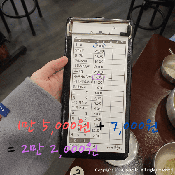 ☞ 만약, 2명 이상의 인원으로 방문하시는 경우에는, 저는 앞서 말씀드린 구성에서 육회와 비빔밥의 수를 늘리시기를 권해드립니다. 이 집에서 가장 인기가 좋은 구성도 이 구성이거니와, 육회낙지탕탕이는 가격이 2만 8,000원인 관계로, 가격적인 부담도 상당하기 때문입니다.