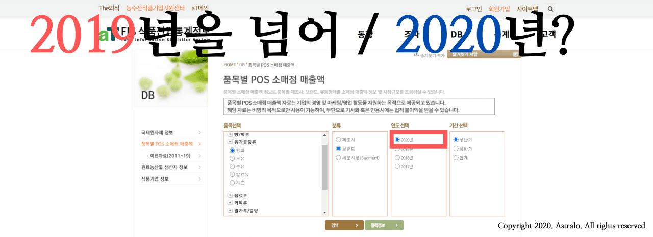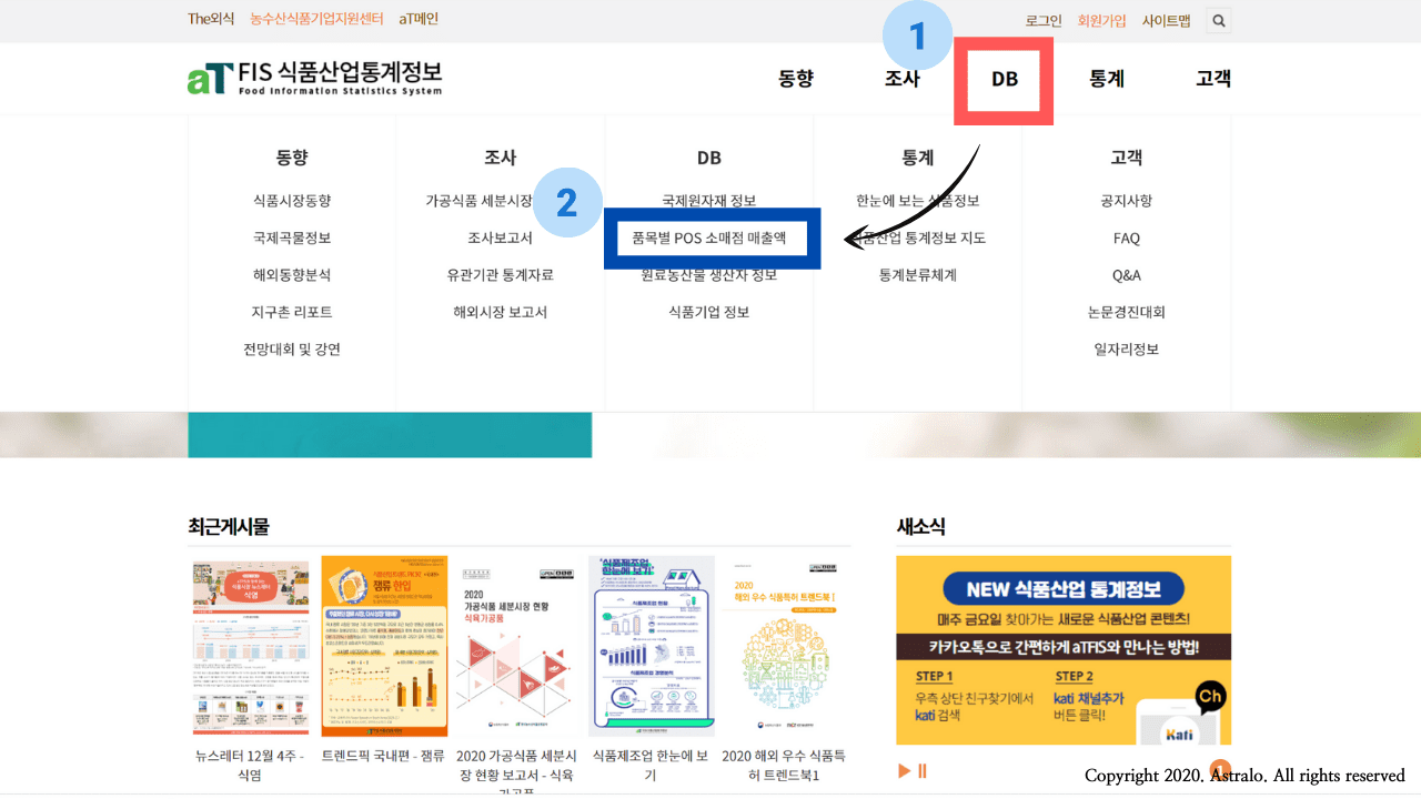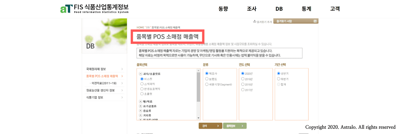 ▲ 페이지의 상단에 위치한 'DB' 탭을 선택해 주세요. 동시에, 'DB'의 하위 카테고리인 '품목별 POS 소매점 매출액' 항목을 클릭해 주세요.