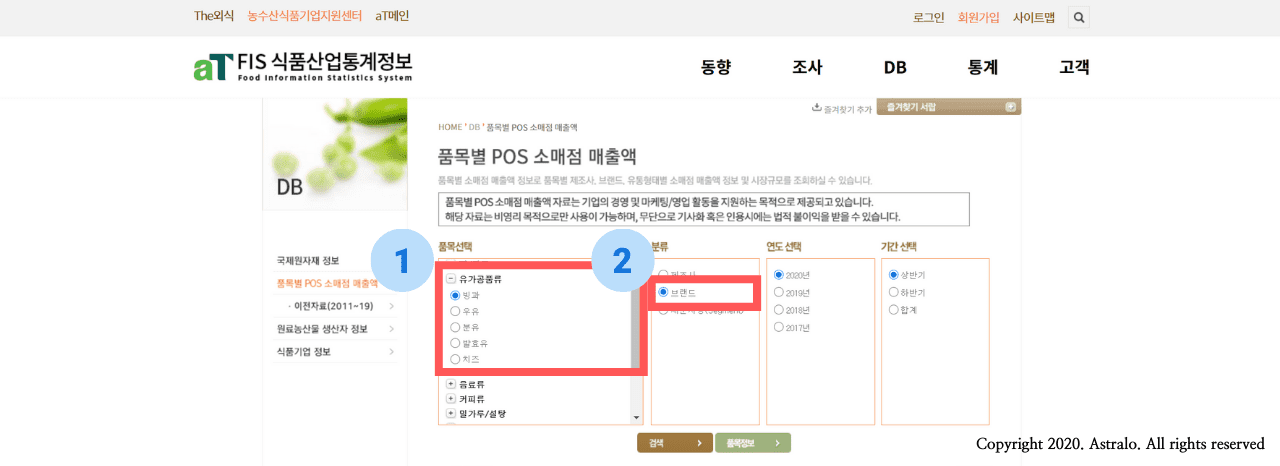 ▲ 품목선택은 '유가공품' 항목의 하위 항목인 '빙과류'를, 분류는 '브랜드' 항목을 선택해 주세요. 또한, 원하시는 연도와 기간을 자유롭게 선택해 주세요.