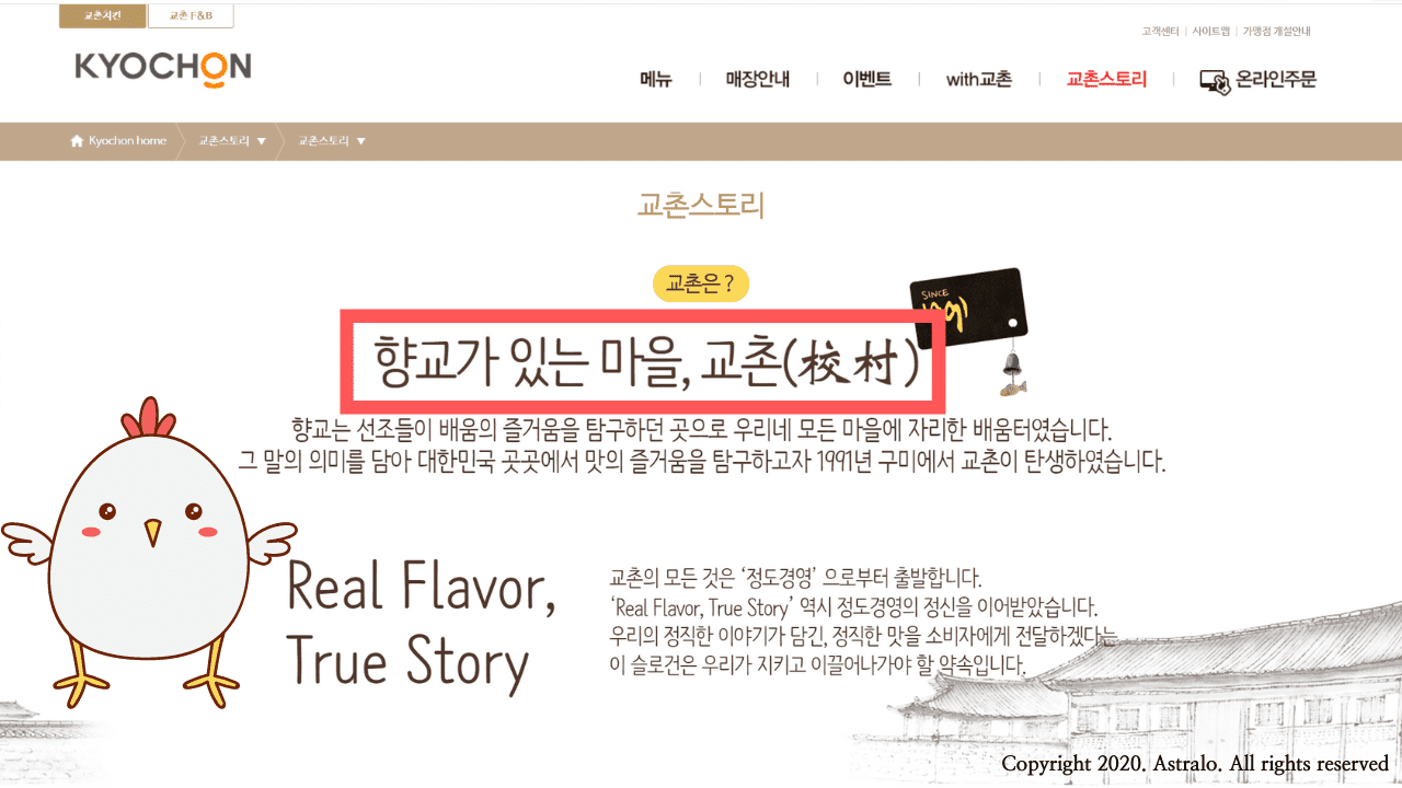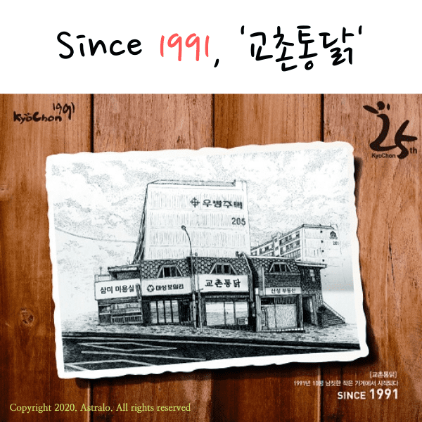 ▲ 교촌치킨은 1991년 3월 13일 경상북도 구미시 송정동에서 '교촌통닭'이라는 작은 통닭으로 시작한 치킨 브랜드입니다. 교촌이라는 말의 의미는, 조선시대에 향교(鄕校)가 있었던 마을을 이르는 말인 교촌(校村)에서 왔다고 합니다.