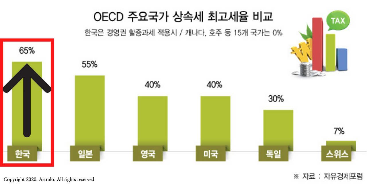 ▲ 현행 상속세 및 증여세법에 따르면, 한국의 상속세 최고세율은 50%입니다. 이는 선진국의 지표로 불리는 OECD 국가들과 비교했을 때도 상당히 높은 세율입니다.