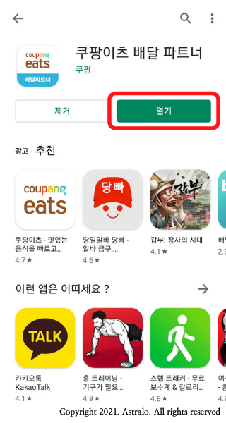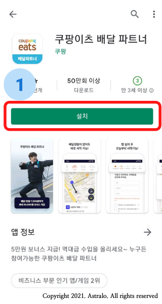 ▲ 우선, 쿠팡이츠 가입은 어플을 통해 간편하게 이루어집니다. 구글 Play Store에서 '쿠팡이츠 배달파트너'를 검색하여 해당 어플리케이션을 설치해 주세요.