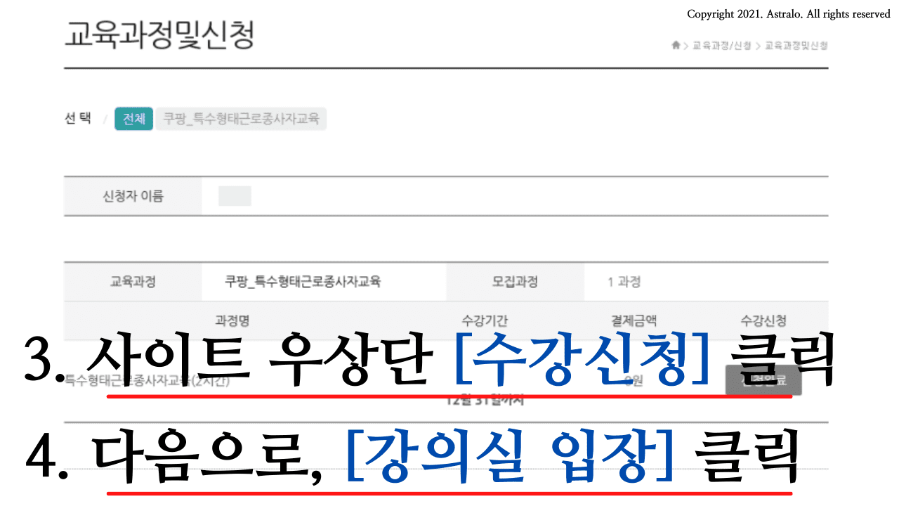 ▲ 오른쪽 상단에 [3. 수강신청] 버튼을 클릭하신 후, [4. 강의실 입장] 버튼을 클릭해 주세요.
