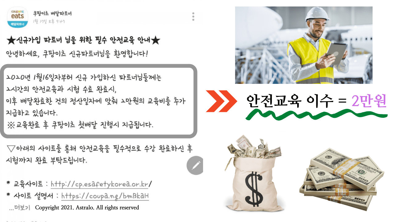 ▲ 기본적으로 안전교육을 이수하지 않아도 배달 업무를 할 수 있습니다. But, 쿠팡이츠는 안전교육 강의를 수료한 배달원이 첫 배달을 완료할 시, 기본 수수료에 2만원을 추가 지급하는 혜택을 부여하고 있습니다.