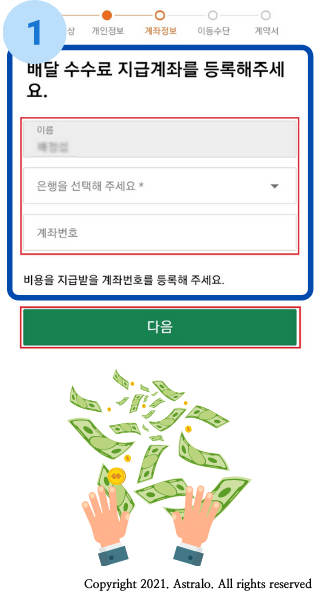 ▲ 가장 중요한 배달 수수료를 입금받을 '계좌번호'를 입력해 주세요.