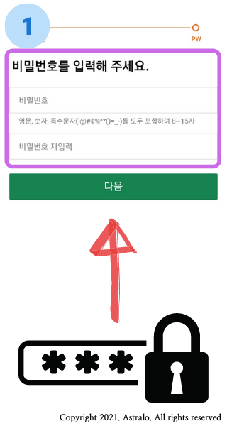 ▲ 다음으로 영문, 숫자, 특수문자를 포함하여 8 ~15자리 비밀번호를 설정해 주세요. 만약 초기화면으로 돌아가시면, 재로그인!