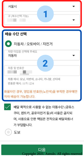 ▲ 배송 희망 지역 및 배송 수단을 선택해 주세요. 마지막으로, 쿠팡이츠와의 계약서를 최종 확인하신 후, 제출하기 버튼을 클릭해 주세요.