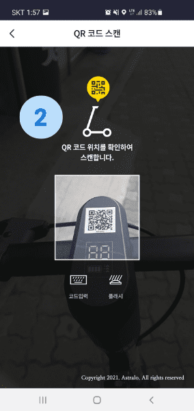 다음으로, 씽씽이에 부착된 [QR코드]를 인식하시면, 바로 씽씽이를 이용하실 수 있습니다.