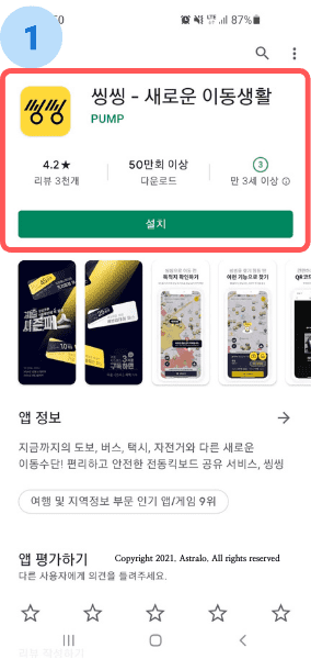 ▲ 씽씽 킥보드를 빠르게 이용하기 위해서는, 우선 플레이스토어에서 [씽씽]을 검색한 후 어플을 다운로드하여 주세요.