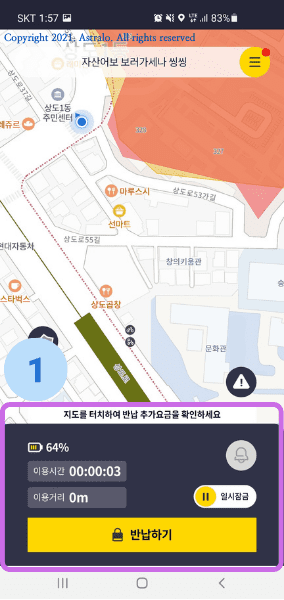 ▲ 씽씽이 어플에 다음과 같은 화면이 뜨면 정상적으로 씽씽이를 대여한 것입니다. 씽씽이를 이용 중에 잠시 주차해야 할 경우, [일시잠금] 기능을 이용하실 수도 있습니다.