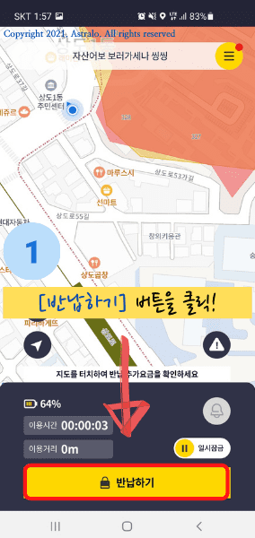 ▲ 즐겁게 씽씽이를 이용하셨다면, 이제 씽씽이를 반납해 볼까요? 씽씽이를 반납하는 방법은 아주 간단합니다. 씽씽이를 주차하신 후, [반납하기] 버튼을 클릭해 주세요.