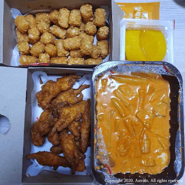 ▲ 우선, 제가 주문한 [로제떡볶이 세트]의 구성은 다음과 같습니다. 메인 메뉴인 로제떡볶이와 서브메뉴인 닭발튀김과 감자폭탄이 보입니다.
