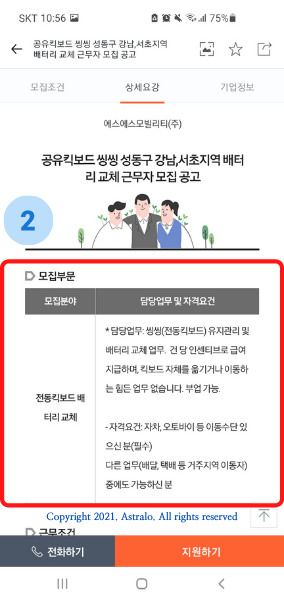 ☞ 씽씽이 배터리 교체 알바에 지원하는 방법은 일반적인 알바를 구할 때의 방법과 비슷합니다. 흔히들 사용하시는 알바몬이나, 알바천국 같은 어플에서 손쉽게 위와 같은 아르바이트 구인 공고를 보실 수 있습니다.