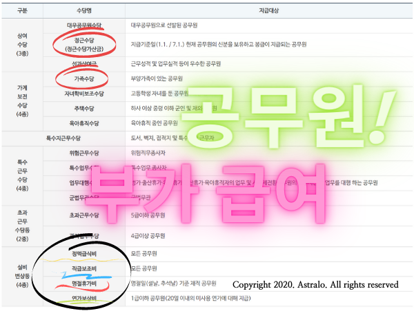 ▲ 특히, 공무원 1년차 때에는 모든 공무원에게 지급된다고 볼 수 있는 '정액급식비, 직급보조비, 명절휴가비, 연가보상비'가 5급 행정관의 연봉 실수령액을 크게 상승시켜줄 수 있어요!