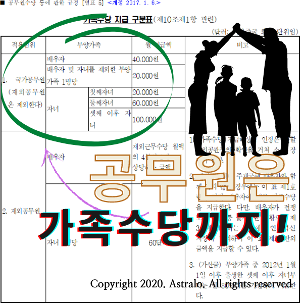 2. 가족수당: 공무원의 배우자, 부양가족 수에 따라서 일정금액을 지급하는 수당입니다.